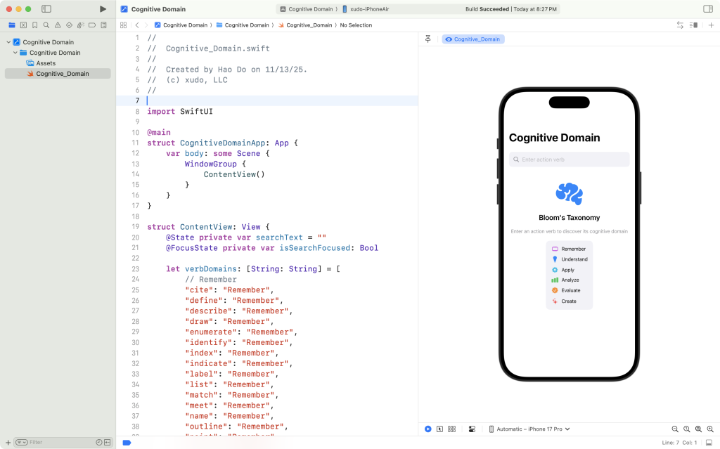 In the process of developing learning objectives, I frequently encounter difficulties in identifying the specific cognitive domain to which an action-verb belongs to from Bloom’s Taxonomy. To address this challenge, I have developed an iOS application that helps determine whether the verb in the learning objective is within a higher-order thinking skill.